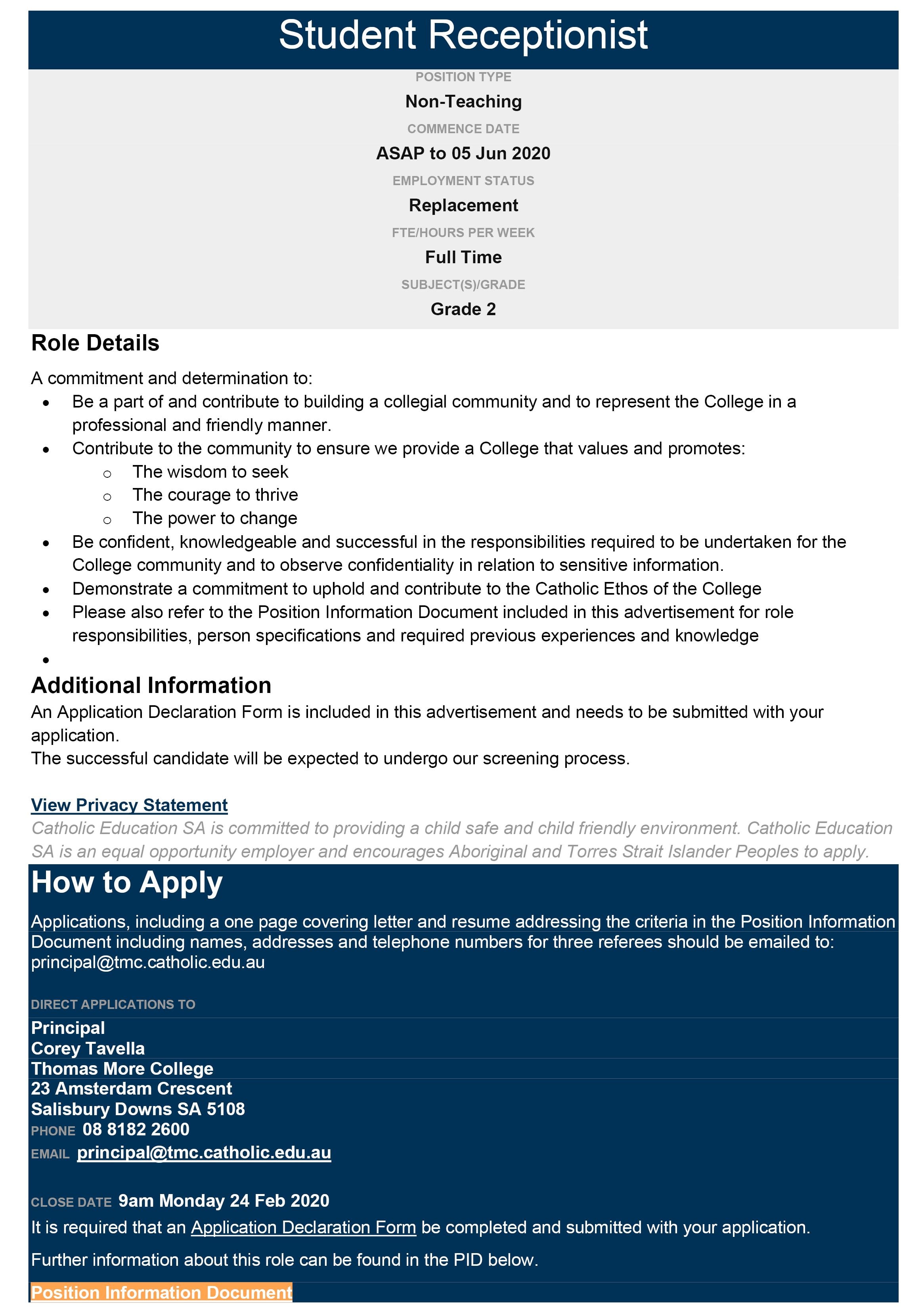 Student Receptionist - Replacement Full Time